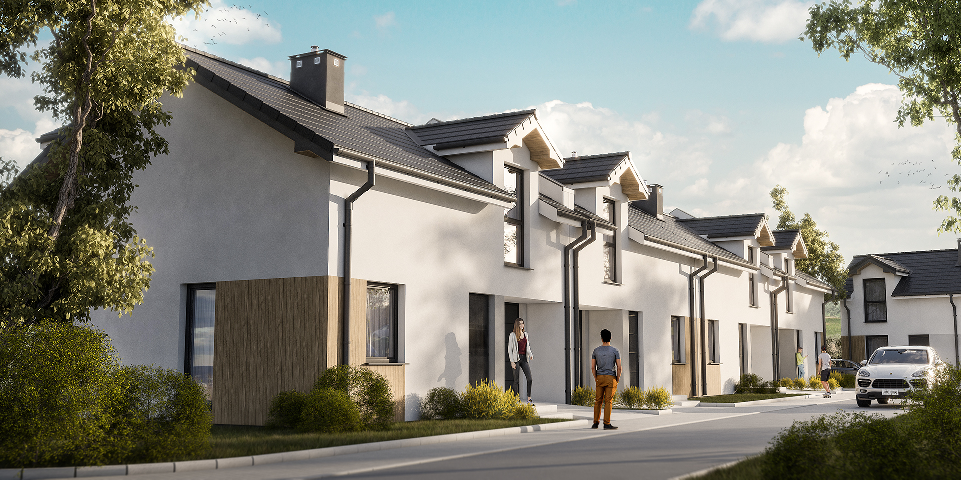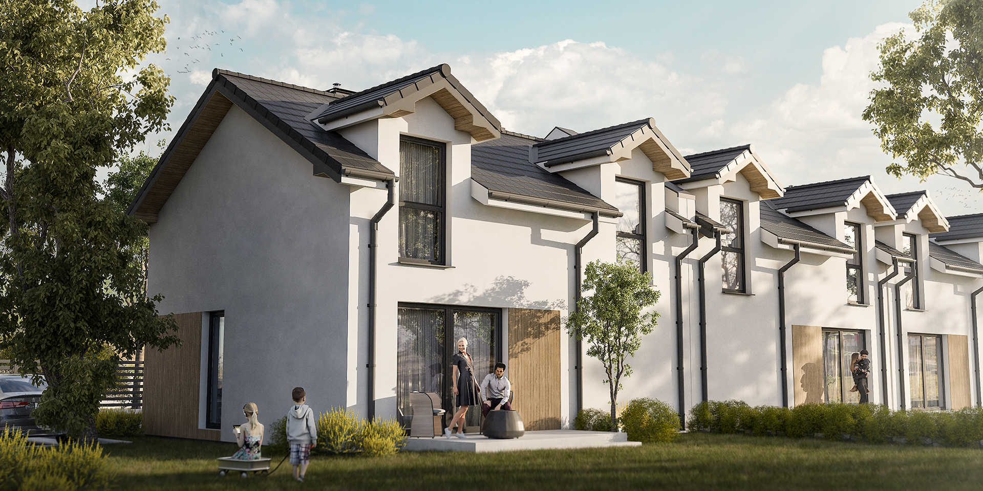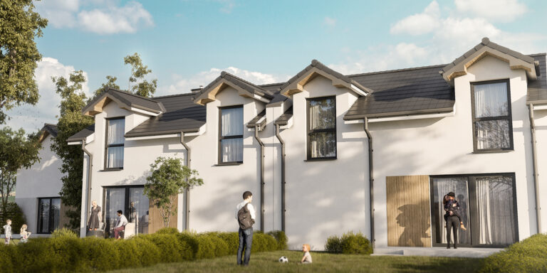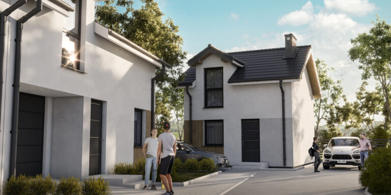 Osiedle przy Parku to kameralna inwestycja, która obejmuje tylko cztery domy w zabudowie szeregowej o pow. 93,20 m² każdy oraz dom wolnostojący o pow. 60,50 m². Szeregowe segmenty mają na parterze m.in. przestronny salon z otwarta kuchnią, WC oraz jednostanowiskowy garaż, a na piętrze mieszczą trzy pokoje (jeden z garderobą) i drugą łazienkę. Do domów przynależą również indywidualne ogródki o powierzchni ok. 39 m² lub ok. 110 m² z tarasami. Samochód możesz także zaparkować na miejscu postojowym, znajdującym się na podjeździe.