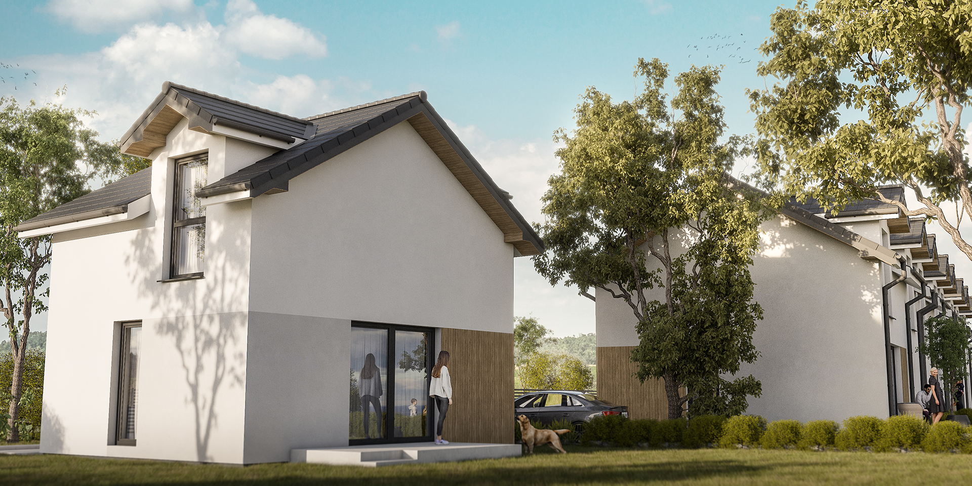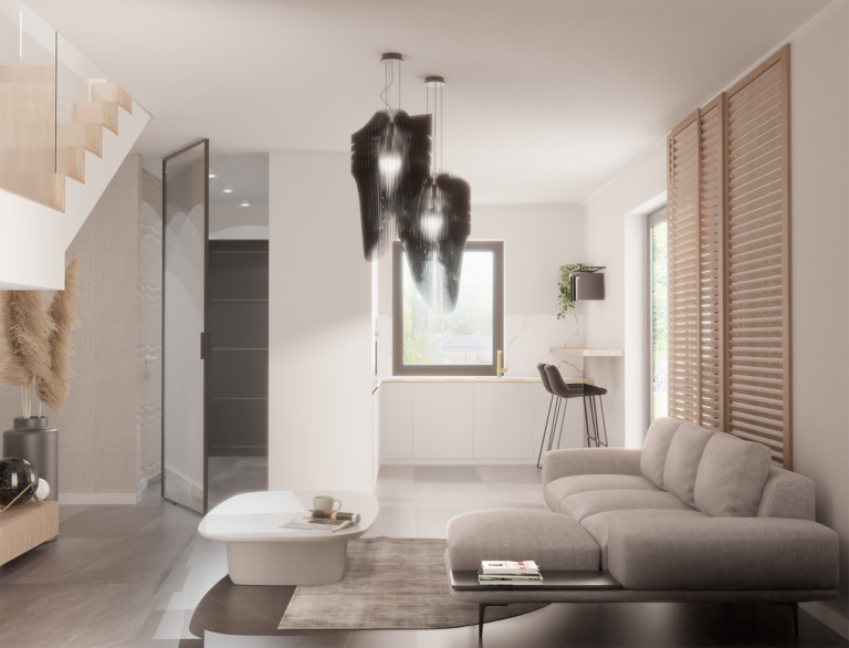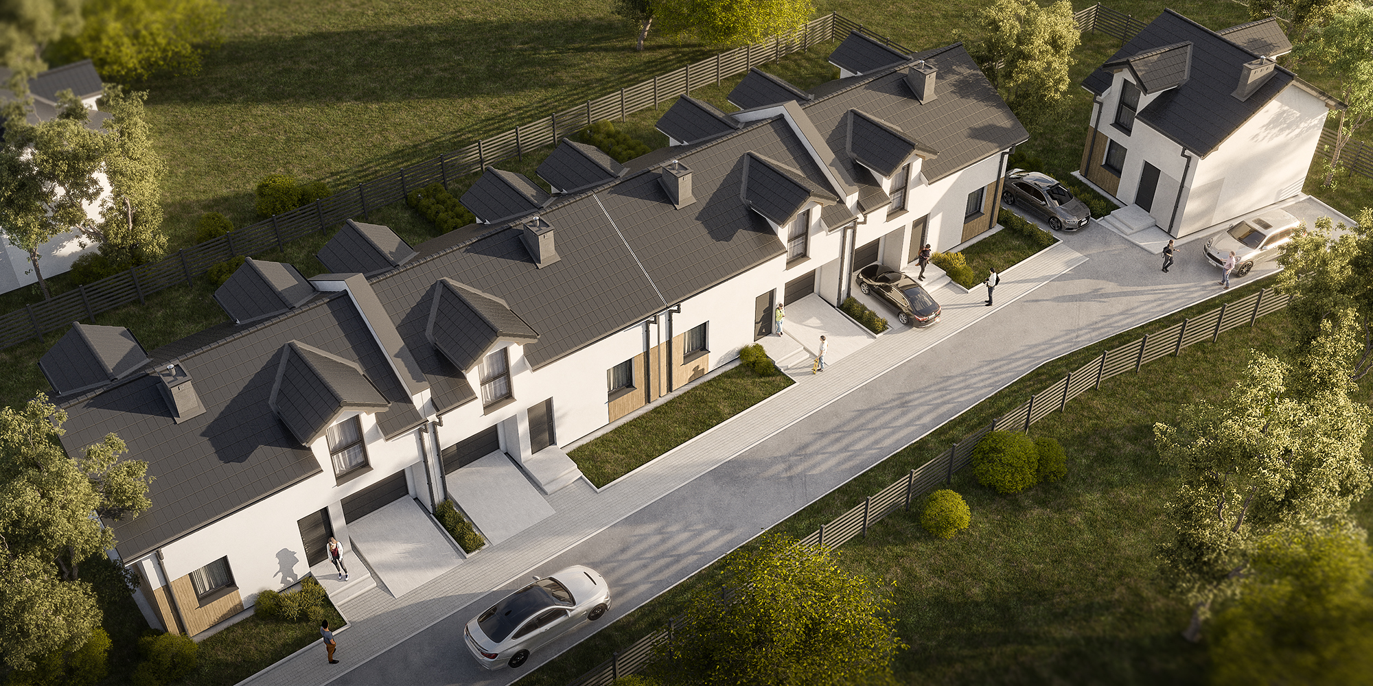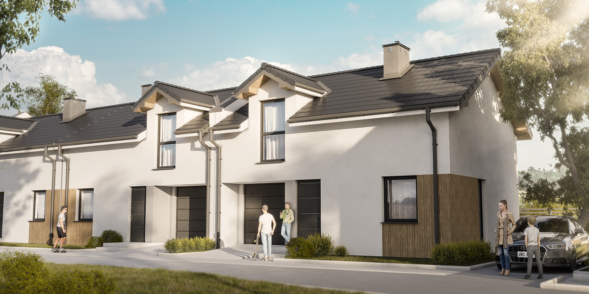 Osiedle przy Parku to kameralna inwestycja, która obejmuje tylko cztery domy w zabudowie szeregowej o pow. 93,20 m² każdy oraz dom wolnostojący o pow. 60,50 m². Szeregowe segmenty mają na parterze m.in. przestronny salon z otwarta kuchnią, WC oraz jednostanowiskowy garaż, a na piętrze mieszczą trzy pokoje (jeden z garderobą) i drugą łazienkę. Do domów przynależą również indywidualne ogródki o powierzchni ok. 39 m² lub ok. 110 m² z tarasami. Samochód możesz także zaparkować na miejscu postojowym, znajdującym się na podjeździe.
