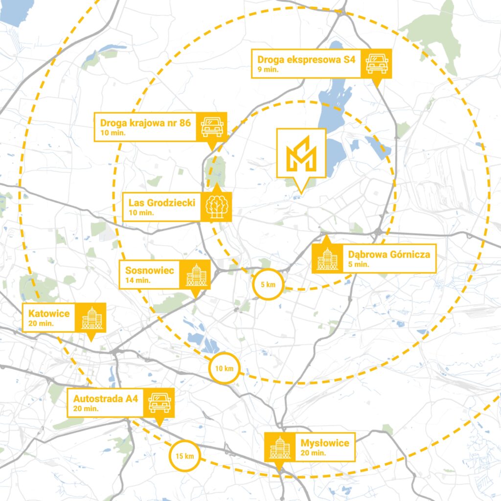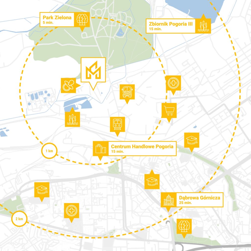 Dojazd do serca miasta zajmuje ok. 5 min. Jeszcze bliżej (samochodem 3 min) znajduje się Fabryka Pełna Życia, czyli nowe centrum Dąbrowy Górniczej, które jest jednym z najistotniejszych przedsięwzięć rozwojowych dla całego regionu. Obecnie odbywają się tam liczne imprezy plenerowe oraz wydarzenia kulturalne. Tuż obok Fabryki położone jest Centrum Handlowe Pogoria, w którym zrobisz zakupy w wielu popularnych sklepach i marketach. Zwiń ∧